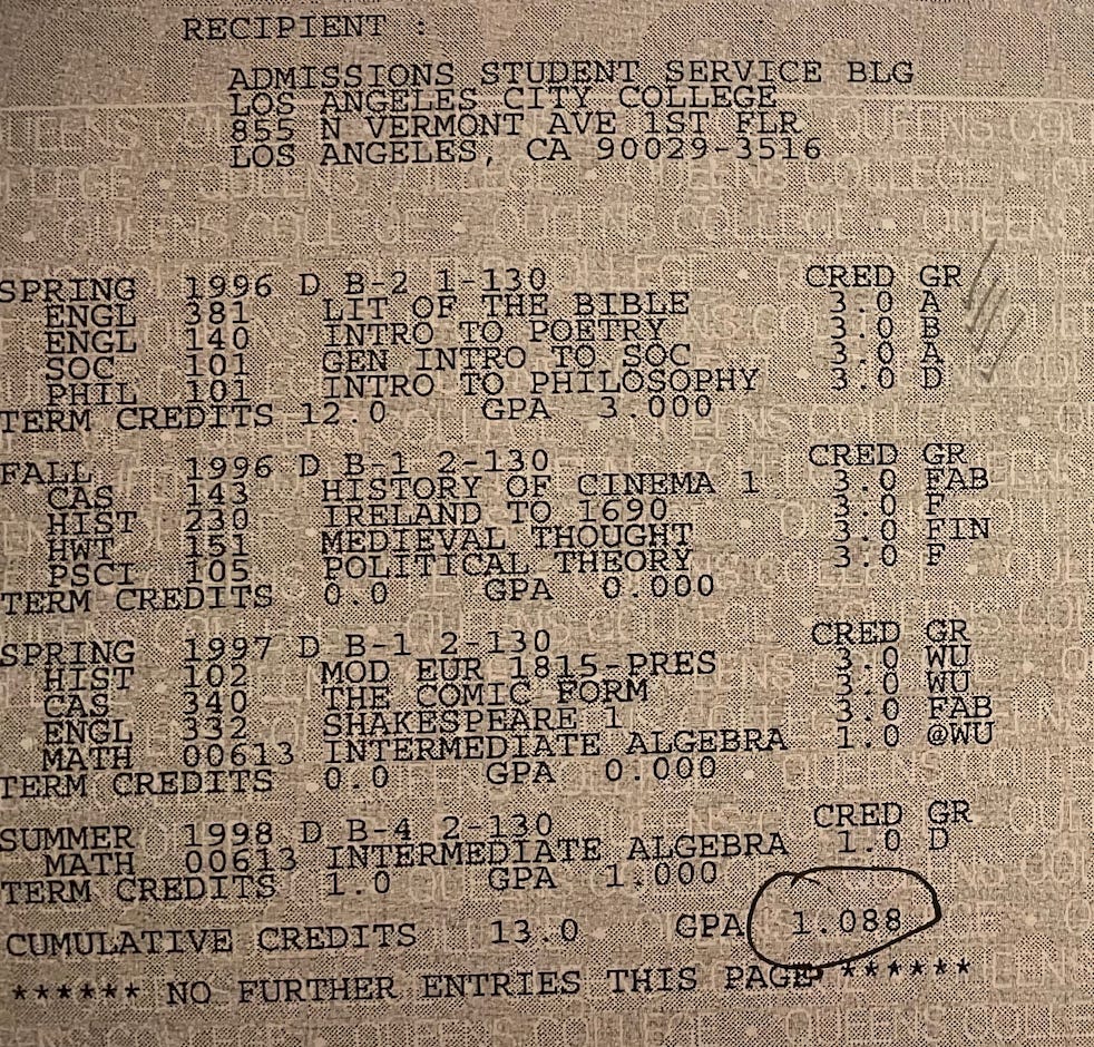 When I applied for USC, I had to come face-to-face with my high school transcripts, which were about what I expected considering I would cut class for months at a time. I also took a look at my Queens College transcript, where it turns out… I had gone back to school and did another semester I then completely forgot about before quitting for good.