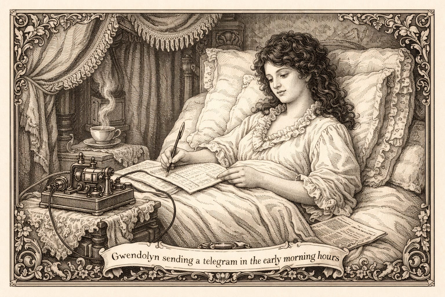 YES I AM TOO DRUNK TO WRITE STATION MASTER JUST SEND WHAT I SAY DAMN THE COST JUST TAKE DICTATION STOP YOOOOOOOO GWENNY STOP YOU ARE THE BEST I MEAN THAT I CANT BELIEVE YOU FLASHED ME YOUR ANKLE RIGHT IN FRONT OF YOUR AUNT YOU ARE SO WILD WHEN I SAW YOUR BARE SKIN BELOW YOUR PETTICOAT I WAS FIT TO EXPLODE STOP NEXT TIME I SEE YOU IM GRABBING YOUR HAND I DON’T CARE WHOS THERE STOP YOU ASKED ABOUT MY PISTOL WELL HERES A PICTURE OF WHAT IM PACKING: 8==D FULL STOP