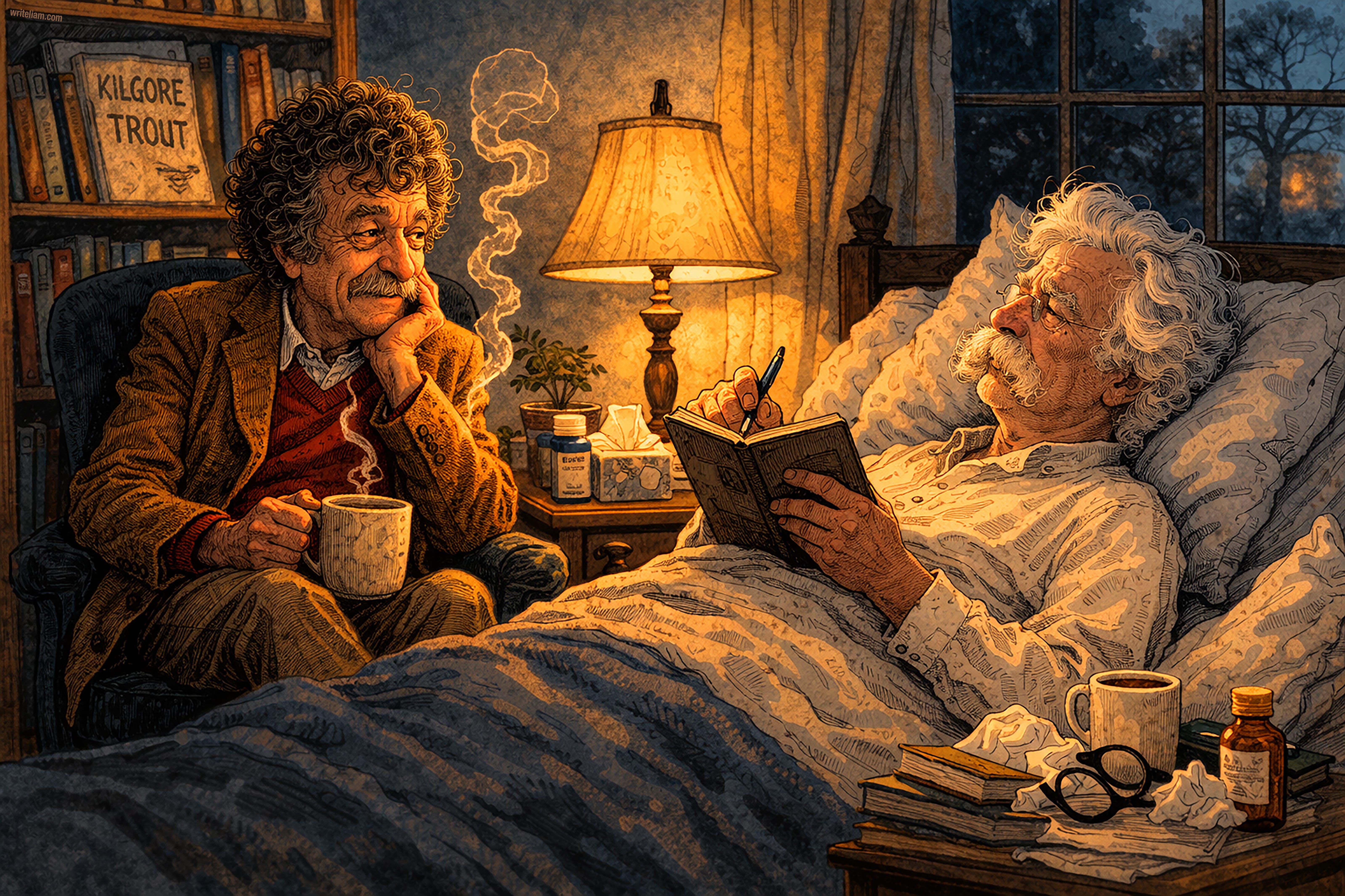 The cold I have makes me feel like someone gave me a going-over with a riding mower. In fact, I’m writing this the same way Mark Twain wrote Huckleberry Finn; in bed, on my back, 16-inch laptop hovering over my head.