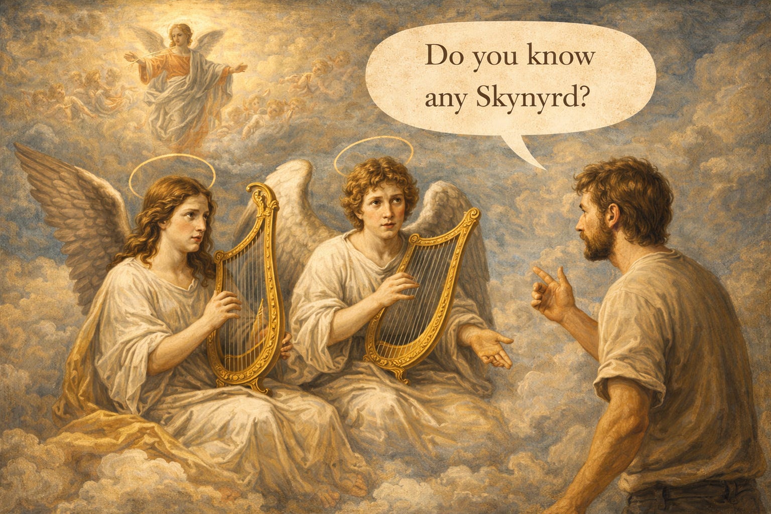 If I’m going to spend my afterlife in Heaven, I will need to be around my people. People who get why I’d ask an angel playing harp if they know any Skynyrd. It’s not to say I don’t want to go, I just don’t want a neighbor who’s going to get mad if I ask the Archangel Metatron if they’re a Transformer.