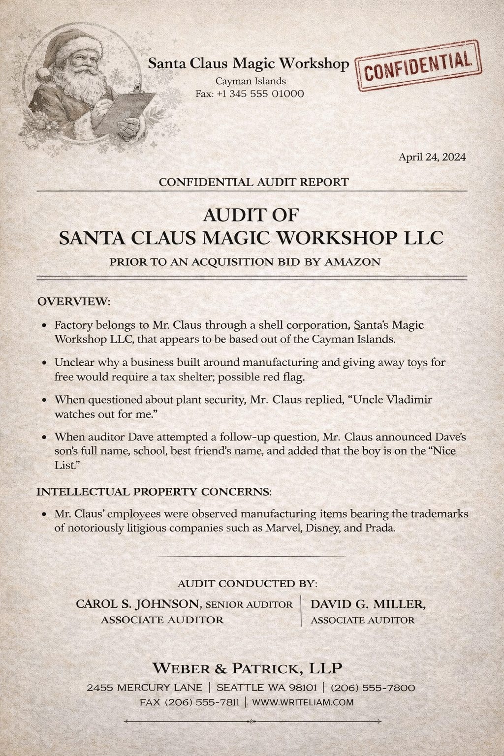 EXCERPTS FROM AN AUDIT CONDUCTED ON THE FACTORY FLOOR OF SANTA CLAUS MAGIC WORKSHOP LLC PRIOR TO AN ACQUISITION BID BY AMAZON