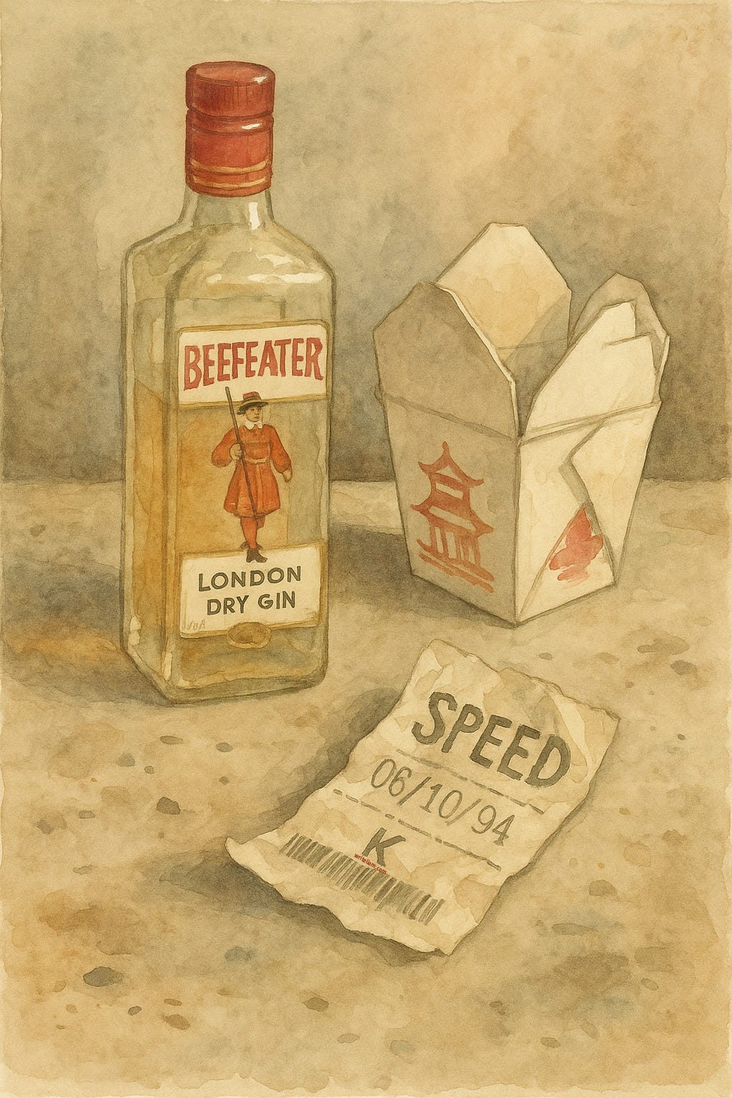 When I was 17, my high school friend Bill and I split a very large bottle of Beefeaters gin and then ate Chinese food and then went to see Speed. Bill threw up all over the couple next to us, and then I got him cleaned up in the bathroom. I sent him off to find his way home on the subway while I watched the rest of the movie. I still have never seen the first fifteen minutes of Speed.