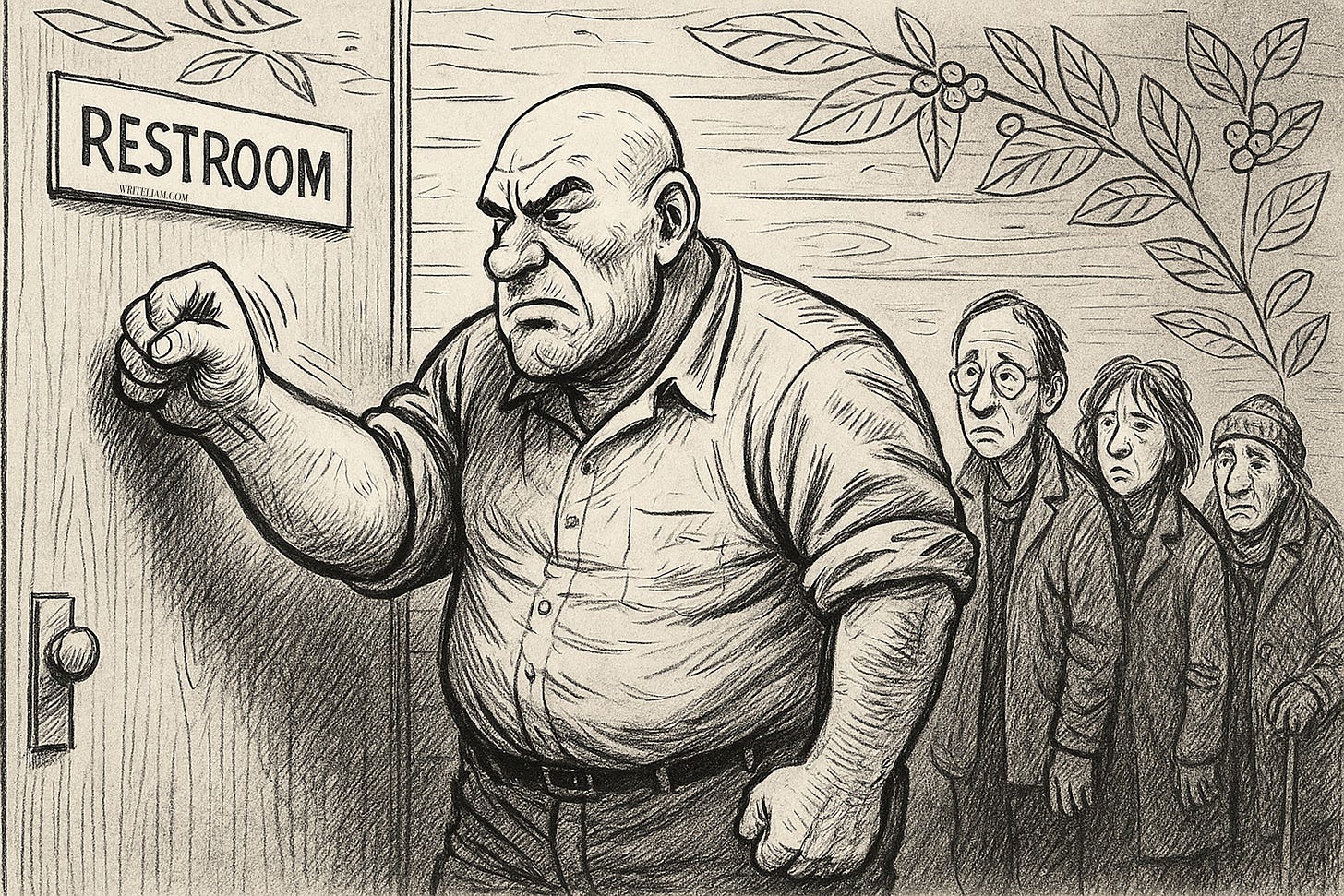 There was peace and quiet for exactly one second, which was then broken by an old man with a cane, thick glasses, and a dirty raincoat, running up to the bathroom door. The Big Guy grabbed the Dirty Old Man and said, “Hey, there’s a line.”